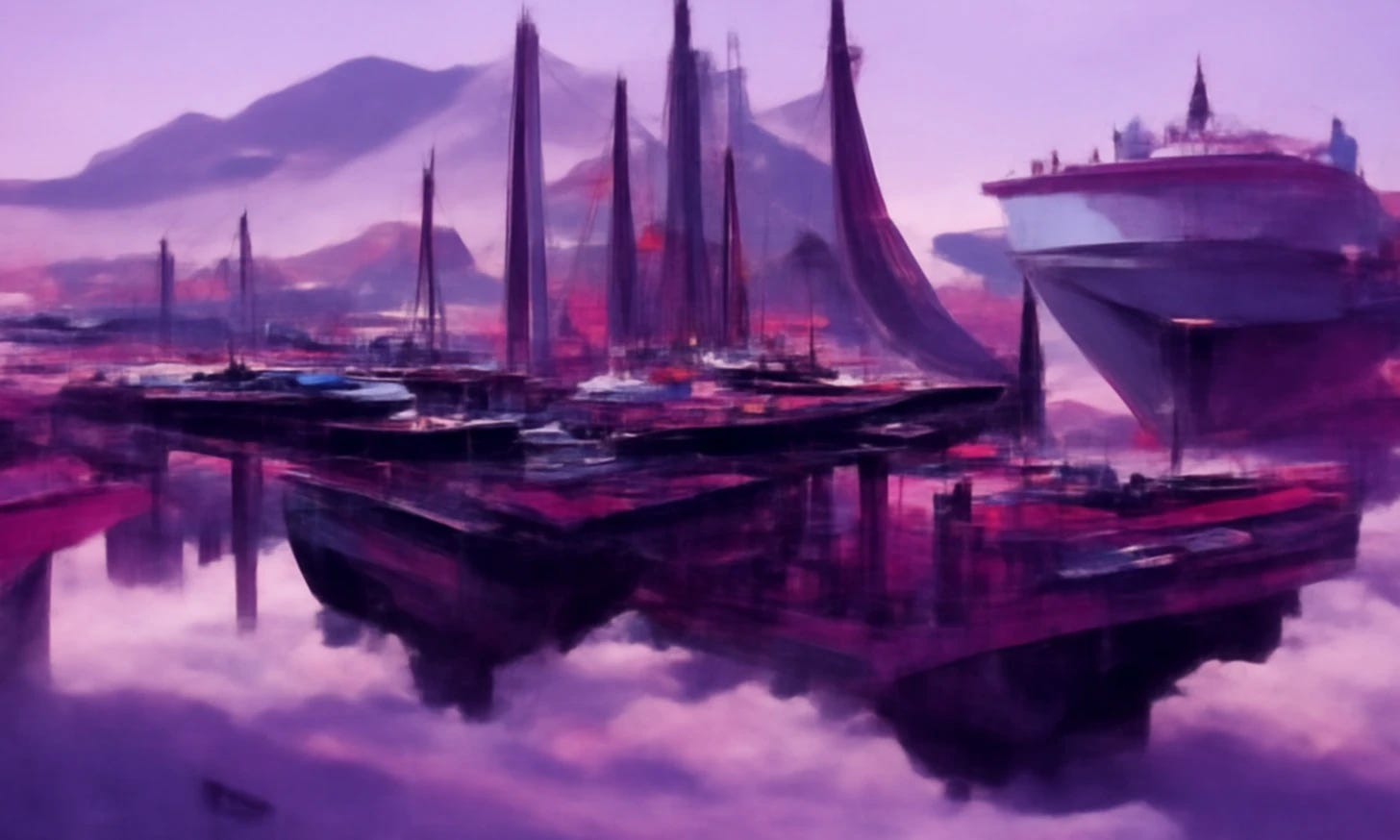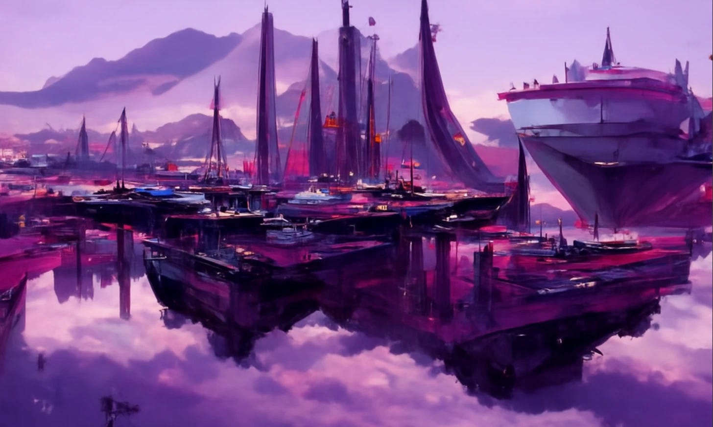 "A beautiful painting of a futuristic port, full of ships floating on a calm sea, surrounded by mountains, by Harry Dafereras and Petar Milivojevic, Trending on artstation.","purple and blue color scheme"5 (last one) - Diffuse: