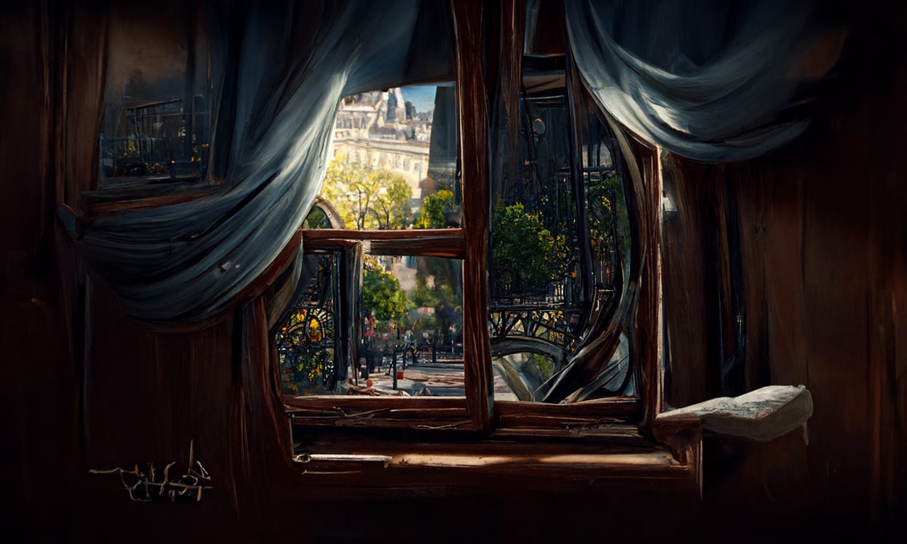 ["A beautiful painting of a window, the city of Paris is outside with the eiffel tower, photorealistic, cinema 4k, final render, detailed, amazing, masterpiece, artstation."]